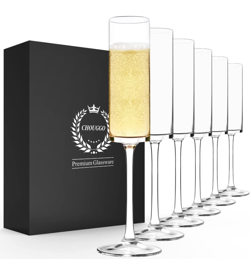 2. Chouggo Champagne Flutes Glass Set of 6, Valentine’s Day Gifts, Hand Blown Crystal Champagne Glasses – Hand Crafted by Artisans – Premium Crystal – 6oz, Clear