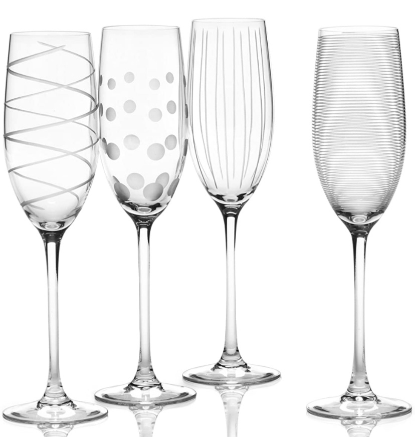 4. Mikasa Cheers Champagne Flutes, Set of 4 flutes with different designs and patterns.