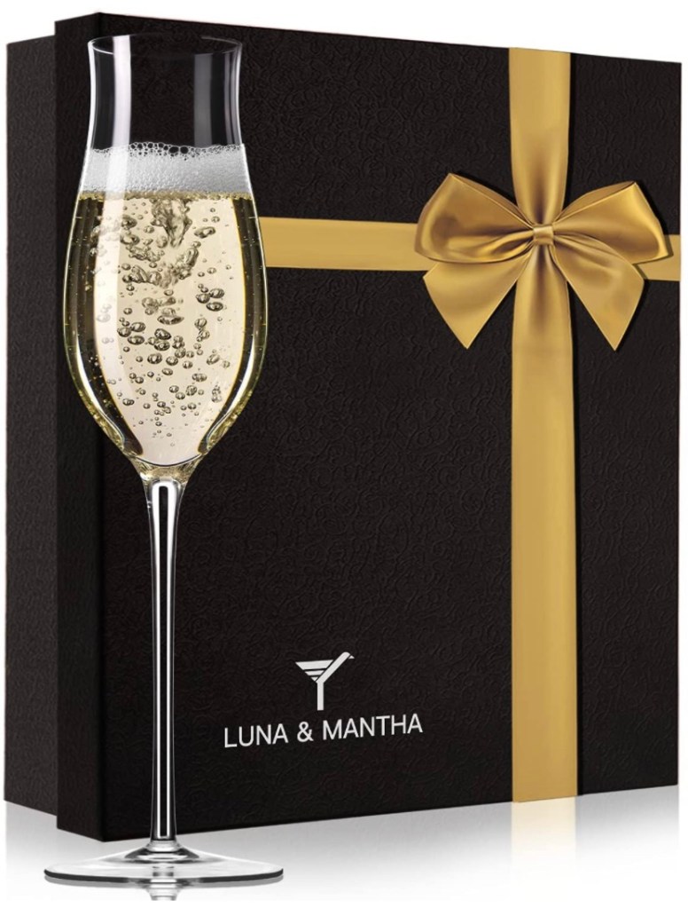 8. Luna and Mantha Unique Crystal Champagne Flutes Glass, Hand Blown Champagne Glasses, Pure Crystal Clear- Elegant Champagne – Set of 2.